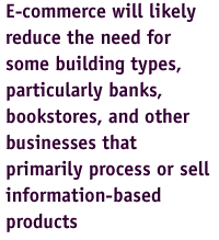 a Boston-based firm that studies the Internet market.E-commerce will likely reduce the need for some building types, particularly banks, bookstores, and other businesses that primarily process or sell information-based products, giving architects a unique opportunityperhaps even a professional responsibilityto create bold schemes for a rapidly changing environment. According to James Culberson, president of the American Bankers Association, soon half of all financial transactions in the United States will be conducted electronically, with one-third of all bank branches closing as a result. With the growth of on-demand publishing and downloadable music, new retail establishments can be designed as compact showrooms with virtually no physical inventory. Whereas certain building types may become obsolete in urban centers, the new digital economy may create a market for residential building in areas heretofore considered impractical. Craig McCaw, telecommunications guru and former owner of McCaw Cellular Communications, insists "the real potential of the Internet is that people can live where they like." Armed with cellular telephones and solar generators, people can build homes beyond the reach of the utility grid and still have access to products from around the world. In Arizona, where $270 a month buys the photovoltaic panels and backup propane generator to run a fully wired household, developers are gobbling up the most remote vistas for luxury housing. Authorities concerned about open-space conservation may find themselves unprepared to deal with a completely new set of land-use issues. Some areas of southeast Arizona considered protected simply by virtue of their inaccessibilitysuch as Bisbee, a former mining town in a chaste canyonare now being developed off the grid as luxury ranches. Although e-commerce promises waste reduction, the truth is that,